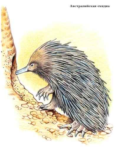 АВСТРАЛИ?ЙСКАЯ ЕХИ?ДНА, млекопитающее сем. ехидновых отр. однопроходных (яйцекладущих). Обитает в Восточной Австралии и на западной её оконечности. Дл. тела ок. 40 см, масса 2,5—6 кг. Тело покрыто толстыми иглами дл. 6—8 см. Наиболее мощные иглы располагаются на загривке, по бокам и вокруг хвоста. Ноги, брюхо и голова покрыты жёсткой тёмно-бурой шерс+тью. Голова заканчивается узким, вытянутым носом дл. 5 см – «клювом». На коротких, сильных лапах мощные когти – тупые на передних и более острые на задних. На втором пальце задних конечностей имеется особенно длинный коготь, используемый для вычёсывания паразитов из иголок и шерсти. Живёт ехидна в зарослях кустарников на каменистых участках. Днём прячется в расщелинах, среди камней, в норах или дуплах. Охотится ночью, пользуясь обонянием и слухом, зрение развито плохо. Питается термитами и муравьями, разрывая их постройки передними лапами и собирая насекомых длинным, липким языком. Зубов нет, насекомых перетирает особыми роговыми зубчиками на языке. Единственное кожистое яйцо (диам. 1,5 см) самка откладывает, лёжа в особой норе. Затем оно ок. 2 недель развивается в выводковой сумке на животе. Детёныш вылупляется слепым, голым и без колючек, дл. 13—15 мм. Он слизывает молоко, вытекающее из млечных протоков, прямо с шерсти матери, т.к. сосков у ехидны нет. Самостоятельным становится через полгода. Австралийская ехидна подлежит строгой охране как редкий представитель уникальной фауны Австралии.