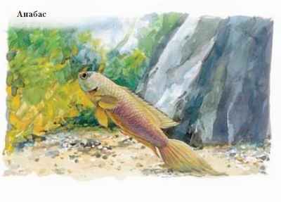 АНАБА?СЫ(ползуны), рыбы сем. ползуновых, или лабиринтовых. Обитают в стоячих и медленно текущих пресных водоёмах Юго-Восточной Азии и Южной Африки, иногда встречаются в солоноватой воде мангровых зарослей. Все анабасы имеют лабиринтовый орган – сложную систему тончайших костных пластинок, покрытых слизистой оболочкой с многочисленными кровеносными сосудами. Расположен он в наджаберной полости; даёт рыбам возможность жить в воде, бедной кислородом, и использовать атмосферный кислород для дыхания, заглатывая его периодически с поверхности воды. Это позволяет рыбам некоторое время находиться вне воды и даже с помощью плавников переползать из водоёма в водоём во время дождя или по росе (отсюда название – ползуны). Лабиринтовым рыбам недостаточно жаберного дыхания, и они не могут обходиться без воздуха.