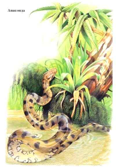 АНАКО?НДА(обыкновенная анаконда), змея рода удавов сем. ложноногих. Наряду с сетчатым питоном относится к самым крупным пресмыкающимся, её длина может достигать 11 м, но обычно не превышает 5—8 м. Окраска оливково-серая, на спине 2 ряда бурых пятен, по бокам – светлые мелкие пятна с чёрной окантовкой. Населяет водоёмы бассейна р. Амазонки, предпочитая заросшие, заболоченные мелководные заводи, старицы и озёра, где малозаметна в серо-зелёной воде. Затаившись среди плавающих листьев и пучков водорослей, змея подстерегает добычу. Схватив жертву острыми зубами, загнутыми внутрь, и удушив в воде, заглатывает её. Молодые анаконды охотятся на рыб, лягушек, черепах, кайманов и др., взрослые змеи заглатывают мелких копытных, других зверьков, а также птиц (от мелких водоплавающих до куриных и индеек). Объект промысла туземного населения (добывают ради мяса, кожи, жира). Становится редким видом прежде всего из-за осушения местообитаний. Анаконд разводят в ряде зоопарков. В неволе обычно живут до 12 лет.