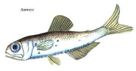 АНЧО?УСЫ, род рыб сем. анчоусовых отр. сельдеобразных. 8 видов, распространены в прибрежных морских водах тропической и умеренной зоны обоих полушарий. Имеются пресноводные виды. В водах России – японский анчоус и европейский анчоус с азовским и черноморским подвидами – хамсой (изредка заходит в Балтийское море). Некрупные (дл. до 15—20 см), серебристо-белые или полупрозрачные, иногда с отливающей металлическим блеском полосой. Тело сигарообразное, покрыто крупной чешуёй, опадающей при лёгком прикосновении. Непомерно большой рот (по сравнению с другими сельдевыми) расположен под нависающим над ним заострённым рылом. Спинной плавник небольшой, расположен посредине туловища, хвостовой плавник с глубокой выемкой. Питаются планктонными животными, которых отфильтровывают на жаберных тычинках, плавая с широко раскрытым ртом.