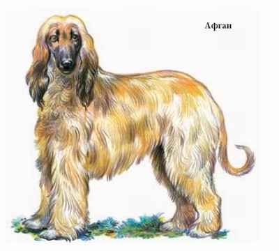 АФГА?Н, порода декоративных собак. Издавна выведена в Афганистане. В Европе известны с 19 в. Очень красивые собаки: стройные, грациозные, с гордо посаженной головой, по обе стороны которой свисают длинные волосы (как бы расчёсаны на прямой пробор). Выс. в холке ок. 70 см. Шерсть длинная, густая, мягкая. Голова клиновидная. Морда длинная. Глаза восточного разреза. Уши длинные, висячие, прилегают к голове. Хвост средней длины, тонкий, кончик загнут в петлю. Окрас палевый, серебристый, голубой, чёрно-подпаловый и др. Разводят в европейских странах, США, Канаде; в России довольно многочисленны.