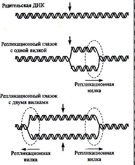 Репликация ДНК начинается не в любой случайной точке молекулы, а в специфических местах, называемых точками начала репликации или олриджинами. Процесс копирования продолжается через образование репликативных вилок в одном или обоих направлениях до тех пор, пока ДНК полностью не удвоится. В замкнутых кольцевых молекулах ДНК новосинтезированные цепи ковалентно соединяются в местах встречи увеличивающихся в размере репликативных вилок или в том месте, где единственная вилка возвращается к точке начала репликации. Дочерние молекулы, как правило, расходятся еще до начала нового раунда репликации.