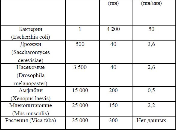 Скорость репликации генома регулируется в основном частотой инициирующих событий. Так, у Е. соli скорость копирования в каждой репликативной вилке постоянна и равна примерно 1500пн в секунду: следовательно, полный геном длиной 4·106пн реплицируется примерно за 40 мин. Если хромосома реплицируется быстрее, это значит, что увеличивается частота актов инициации в той же самой точке начала репликации при прежней скорости копирования. Клетки Е. соli делятся каждые 20 мин; это означает, что репликация ДНК инициируется в хромосомах, еще не закончивших предыдущий раунд репликации. Скорость движения репликативной вилки в эукариотических клетках значительно меньше (10-100пн в секунду), но завершение репликации хромосомы в разумное время обеспечивается одновременной инициацией во множестве точек. Итак, скорость репликации хромосом контролируется числом и расположением точек начала репликации. Например, в ранних эмбрионах дрозофилы репликация отдельной хромосомы осуществляется каждые 3 мин, благодаря почти одновременной инициации событий в точках, отстоящих друг от друга на 7000-8000пн. В тоже время известно, что у дрозофилы в ходе раннего эмбрионального развития, как скорость репликации, так и размеры и число репликонов тканеспецифичны. В культуре же соматических клеток той же дрозофилы скорость удвоения хромосом значительно более медленная, так как репликация начинается в гораздо меньшем числе точек, находящихся друг от друга на расстоянии 40000пн, при этом продолжительность S-фазы составляет 600 мин. Следовательно, при фиксированной скорости синтеза ДНК множественная инициация повышает скорость процесса репликации в целом и таким образом уменьшает время, необходимое для удвоения всего набора хромосом. Данные о числе репликонов и скорости репликации приведены в табл.1.