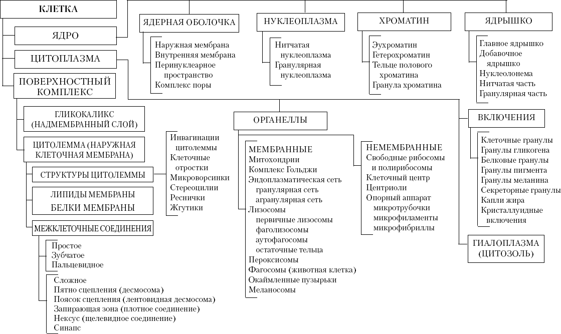 Для всех клеток типично наличие цитоплазмы и ядра (см. рис. 1). Цитоплазма включает в себя гиалоплазму. В клетках встречаются также временные клеточные структуры включения.