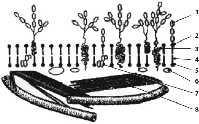 1 – углеводные цепи; 2 – гликолипид; 3 – гликопротеид; 4 – углеводородный «хвост»; 5 – полярная «головка»; 6 – белок; 7 – холестерин; 8 – микроктрубочки
