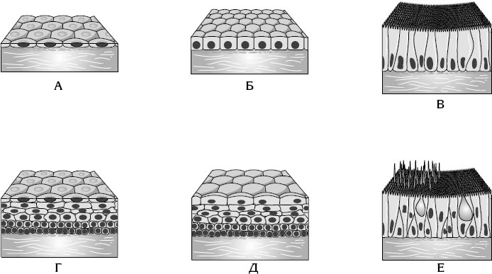 А – однослойный плоский эпителий; Б – однослойный кубический эпителий; В – однослойный цилиндрический эпителий Г – многослойный плоский неороговевающий эпителий; Д – переходный эпителий; Е – псевдомногослойный реснитчатый эпителий