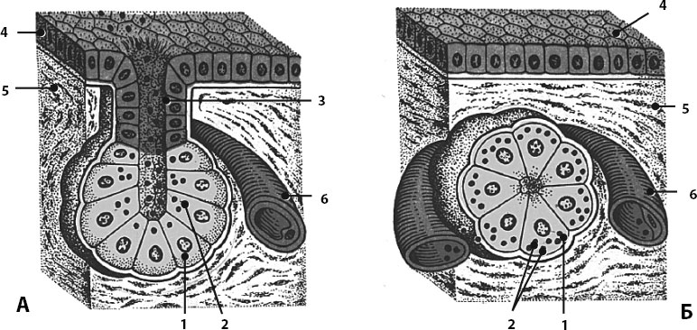 А – экзокринная железа, Б – эндокринная железа; 1 – начальный отдел; 2 – секреторные гранулы; 3 – выводной проток экзокринной железы; 4 – покровный эпителий; 5 – соединительная ткань; 6 – кровеносный сосуд