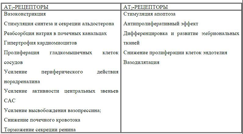 Физиологические эффекты А-II, опосредованные АТ1 и АТ2 рецепторами – ангиотензиновыми рецепторами первого и второго типов