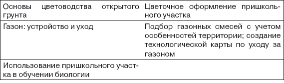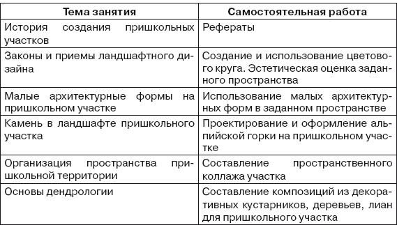 Самостоятельная деятельность студентов заключается в выполнении заданий по проектированию определенных зон пришкольной территории с использованием современных приемов оптимизации ландшафта с учетом правил подбора посадочного материала и создания декоративных групп из древесно-кустарниковых пород и цветочных культур.
