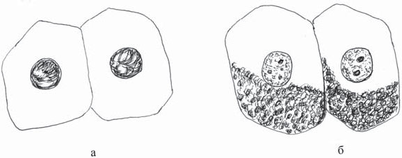 Рис. 2.2. Выявление ДНК по Фельгену (а) и гликогена после гидролиза в периодате (б) с помощью обесцвеченного основания фуксина. Клетки печени аксолотля.