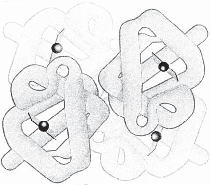 Четвертичная структура белка представляет собой сложное функциональное объединение нескольких полипептидных молекул с третичной структурой. Например, молекула белка гемоглобина включает в себя четыре полипептида с третичной структурой: две молекулы a-гемоглобина и две молекулы b-гемоглобина. Кроме того, в центре этой сложной молекулы находится гетероциклическое соединение, в состав которого входит железо. Функциональная особенность гемоглобина, как и других белковых молекул, зависит от его пространственной конфигурации (рис. 3.2).