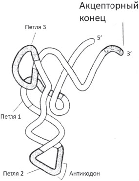 Рис. 3.6. Строение молекулы тРНК. Один ее конец (акцепторный) предназначен для присоединения аминокислоты. Второй важный участок – антикодон, состоящий из трех нуклеотидов (по Албертс, Брей, Льюис и др., 1994).