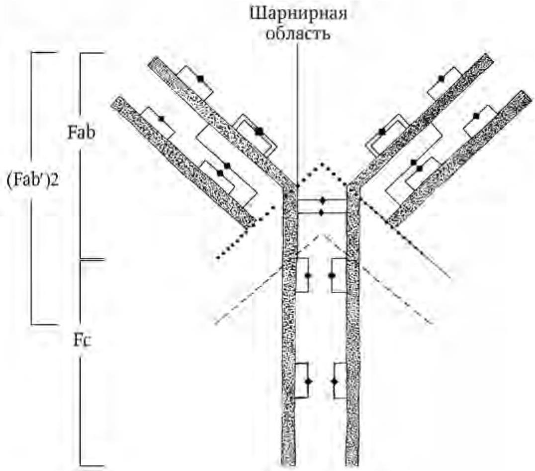 При помощи папаина антитела можно расщепить на два одинаковых антигенсвязывающих Fab-фрагмента (fragment antigen binding) и Fc-фрагмент (fragment cristalizable), способный к кристаллизации. Область Fab образована гипервариабельными участками Ни L-цепей и определяет антигенную специфичность; Fc-фрагмент осуществляет эффекторные функции (связывание иммуноглобулина с клетками, компонентами комплемента) (Atassi M. Z., 1984). К Fc-фрагменту антител можно присоединять различные вещества, что используется при постановке иммунохимических реакций.