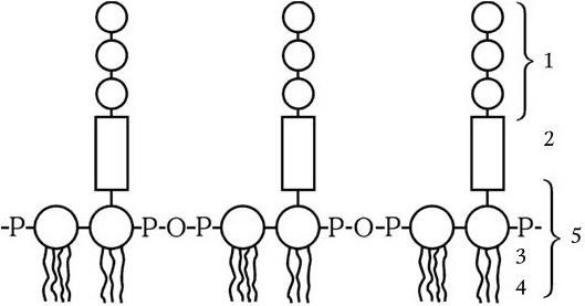1 – повторяющиеся единицы; 2 – ядро; 3 – полимер дисахарид-фосфата; 4 – жирные кислоты; 5 – липид