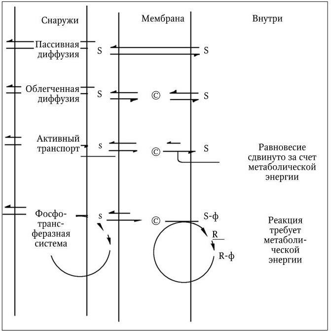 Разная длина стрелок указывает на сдвиг равновесия реакции в сторону более длинной стрелки. S и s означают соответственно высокую и низкую концентрации растворенных веществ; © – белок-переносчик (пермеаза); R – белок HРr; R-ф – фосфо-HРr; ф – фосфатная группа