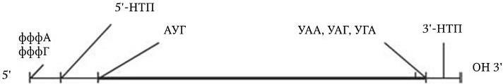 1. 5'-нетранслируемая последовательность (5'-НТП). 5'-концевой нуклеотид содержит, как правило, одно из пуриновых оснований (А или Г), и, если после транскрипции мРНК не подвергалась никаким изменениям, этот нуклеотид несет трифосфатную группировку (5'фффГ…3').