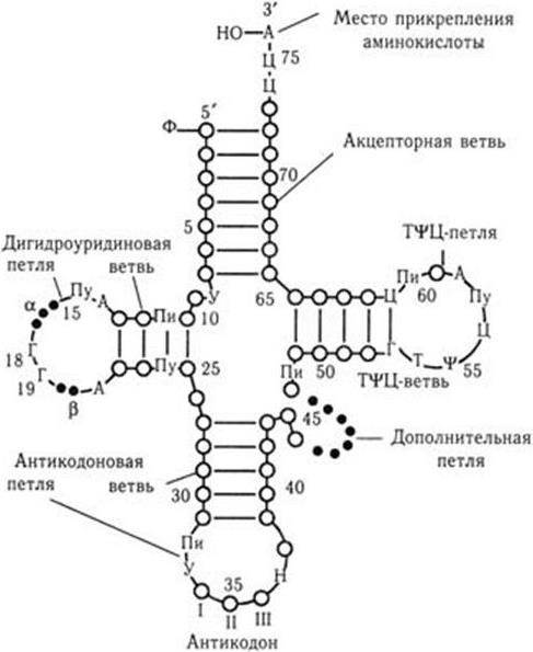 Характерной особенностью всех типов тРНК является высокое содержание в них необычных оснований, например, инозина (И), дигидроуридина (дигидро-У), псевдоуридина (?); всего в разных типах тРНК обнаружено более 50 вариантов модифицированных оснований. В зависимости от их специфичности к аминокислотам, которые они транспортируют к рибосомам, различают аланиновые тРНК (тРНКала), тирозиновые (тРНКтир), валиновые (тРНКвал) и т. д.