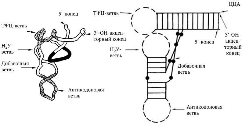Обладая сходной первичной структурой, все тРНК имеют и сходную пространственную структуру (рис. 23). Молекула тРНК содержит два сегмента двойных спиралей, закрученных по длине. Они ориентированы друг к другу почти под прямым углом, образуя структуру, напоминающую букву Г. Псевдоуридиновая ветвь (Т?Ц) располагается в углу молекулы, близко к ней примыкает дигидроуридиновая ветвь (Н2У). На коротком конце молекулы располагается акцепторный участок – ЦЦА (место присоединения аминокислоты). Длинный конец молекулы заканчивается триплетом оснований, образующих антикодон.