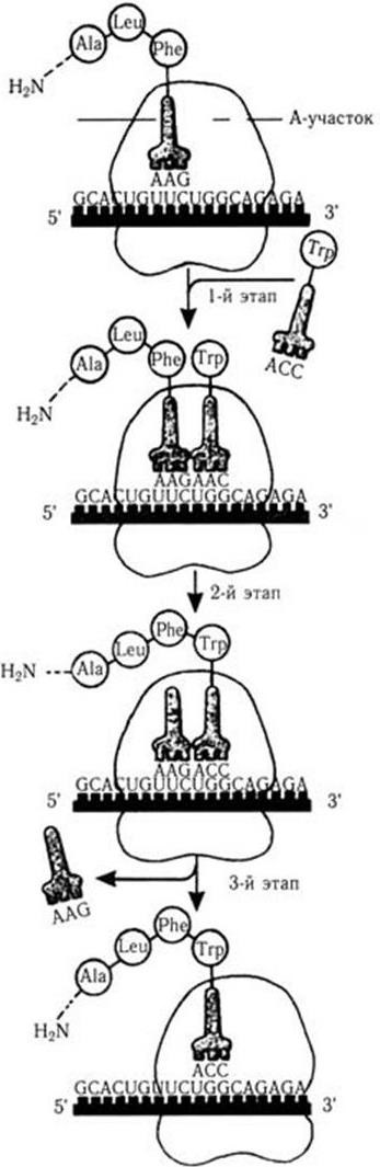 Элонгация протекает как многократно повторяющийся (по числу кодонов в мРНК) циклический процесс, складывающийся из трех отдельных этапов (рис. 26).