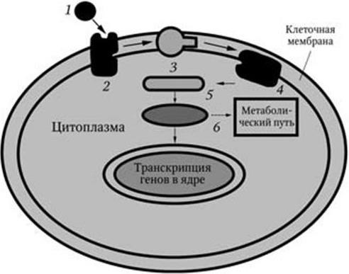 1 – связывание внеклеточного сигнального агента; 2 – клеточный рецептор; 3 – белок-передатчик; 4 – мембранный фермент; 5 – вторичный мессенджер; 6 – киназы и фосфатазы