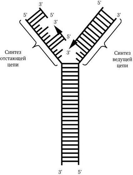 Рис. 42. Схематическое изображение репликации ДНК прерывистой (отстающей) и непрерывной (ведущей) цепей