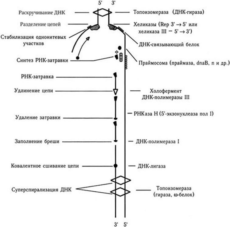 Рис. 43. Схематическое изображение состава и функционирования компонентов репликативного комплекса