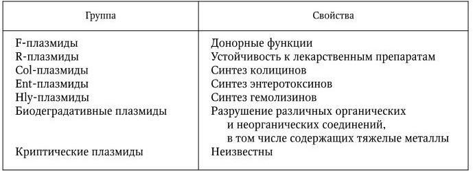 В соответствии с теми свойствами, которыми плазмиды наделяют своих носителей, их подразделяют на различные группы (табл. 4).