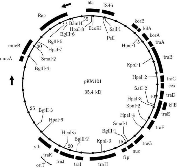 Рис. 50. Молекулярная организация плазмиды pKM101. Конъюгативная плазмида pKM101 IncN-группы является производной плазмиды R46, у которой утрачена область генов, контролирующая устойчивость к антибиотикам. Широко используется для изучения механизмов генетической регуляции плазмидных функций