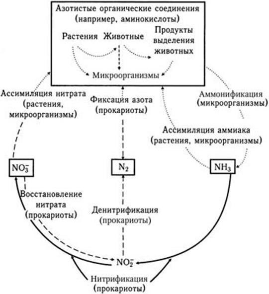 Запасы азота в природе очень велики. Он входит в состав всех организмов на Земле. Общее содержание его в организмах составляет более 25 млрд тонн, большое количество азота находится также в почве. Но еще более грандиозен запас азота в атмосфере: над каждым гектаром почвы поднимается столб воздуха, содержащий около 80 000 тонн молекулярного азота. Ежегодно на образование вновь вырастающих растений требуется около 1,5 млрд тонн азота в форме, доступной для усвоения растениями. Имеющегося в воздухе и почве азота хватило бы для обеспечения урожая, даже при одностороннем использовании, на несколько миллионов лет. Однако растения часто дают низкие урожаи именно из-за недостатка азота в почве. Это объясняется тем, что только небольшая группа азотистых соединений может быть быстро усвоена растениями. Не только свободный азот, но и многие формы связанного азота не могут служить источником азотного питания для растений. Азот, поступающий в виде белковых веществ в почву вместе с остатками растений и животных, совсем не годится для этих целей, он должен быть подвергнут минерализации, а образующийся при этом аммиак должен быть окислен в соли азотистой и азотной кислот. В основе процессов круговорота азота лежат следующие биохимические процессы: гниение белков, разложение мочевины, нитрификация, денитрификация и фиксация атмосферного азота.