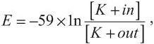 где –59 – коэффициент, отражающий заряд и валентность иона; в числителе дроби – концентрация ионов внутри клетки; в знаменателе – снаружи. Рассчитанная таким образом величина калиевого равновесного потенциала составляет около –85…–90 мВ.