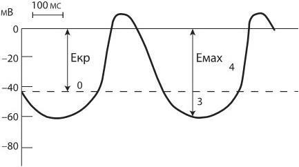 Можно полагать, что эти события происходят последовательно: вначале уменьшаются выходящие калиевые токи IKS и IKR, которые ранее обеспечивали фазу 3 (конечной реполяризации) потенциала действия пейсмекерной клетки; затем увеличивается входящий натриевый ток If, и на заключительном этапе спонтанной диастолической деполяризации усиливаются входящие кальциевые токи ICa2+T и Ist. В результате мембранный потенциал клетки достигает критического уровня деполяризации (около –40 мВ), что приводит к активации кальциевых каналов L-типа, усилению входящего тока ICa2+L и развитию фазы 0 (быстрой деполяризации) потенциала действия.
