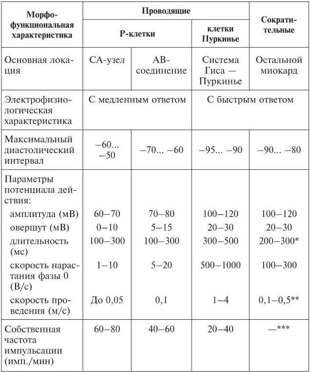 В настоящее время пока невозможно ответить на вопрос о причинах спонтанного открытия и закрытия ионных каналов, поскольку нет общей гипотезы и модели возникновения самогенерации электрических колебаний в живых системах, равно как и гипотезы возникновения биоритмов. Поэтому электрофизиологические процессы, происходящие в кардиомиоцитах при возбуждении, требуют дальнейшего изучения. Знание процессов, лежащих в основе нормальной электрофизиологии сердца, позволяет понять механизмы развития различных видов нарушений ритма и проводимости миокарда, а также синтезировать новые антиаритмические препараты. Таким образом, сложные процессы вероятностного открытия и закрытия ионных каналов, вызывающие усиление или уменьшение входящих и выходящих ионных токов, определяют особенности потенциалов действия и электрофизиологические свойства «медленных» и «быстрых» кардиомиоцитов, сравнительная характеристика которых представлена в табл. 1 и 2.