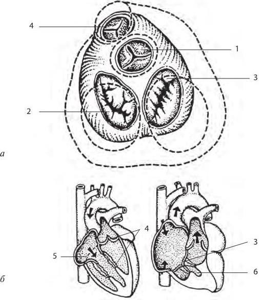 а – разрез в поперечной плоскости. Пунктиром показаны контуры желудочков и отверстий; б – разрез во фронтальной плоскости; 1 – полулунные клапаны аорты; 2 – трехстворчатый клапан; 3 – двустворчатый клапан; 4 – полулунные клапаны легочной артерии; 5 – систола предсердий; 6 – систола желудочков