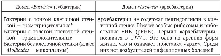 Бактерии крупнее вирусов, большинство из них можно увидеть с помощью обычного светового микроскопа, они представлены примитивными клетками. Прокариотная клетка меньше эукариотной, имеет менее выраженную специализацию органоидов, ДНК в ней окружена ядерной мембраной, а органеллы типа митохондрий и хлоропластов отсутствуют. Согласно 2-му изданию (2001) руководства Берджи бактерии делят на два домена: «Bacteria» и «Archaea» (табл. 5).
