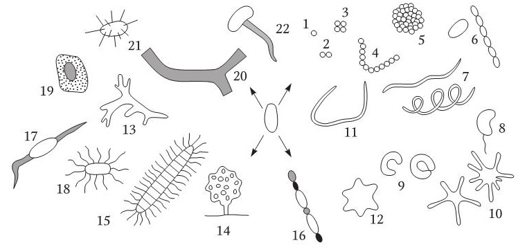 1 – кокк; 2 – диплококк; 3 – сарцина; 4 – стрептококк; 5 – колония сферической формы:6 – палочковидные бактерии (одиночная клетка и цепочка клеток); 7 – спириллы; 8 – вибрион; 9 – бактерии, имеющие форму замкнутого или незамкнутого кольца; 10 – бактерии, образующие выросты; 11 – бактерия червеобразной формы; 12 – бактериальная клетка в форме шестиугольной звезды; 13 – представитель актиномицетов; 14 – плодовое тело миксобактерии; 15 – нитчатая бактерия рода Caryophanon с латерально расположенными жгутиками; 16 – нитчатая цианобактерия, образующая споры (акинеты) и гетероцисты; 8, 15, 17, 18 – бактерии с разными типами жгутикования; 19 – бактерии, образующие капсулу; 20 – нитчатые бактерии группы Sphaeroillus, заключенные в чехол, инкрустированный гидратом окиси железа; 21 – бактерия, образующая шипы; 22 — Galionella