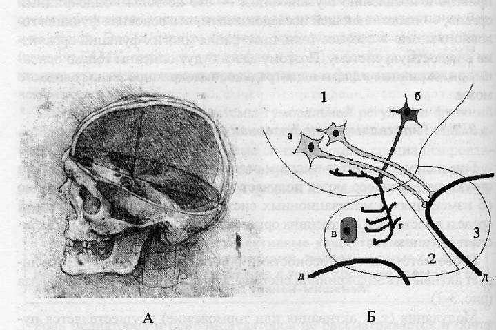Рис. 3–1. А – рисунок Леонардо да Винчи. Гипоталамус располагается примерно в точке пересечения плоскостей.