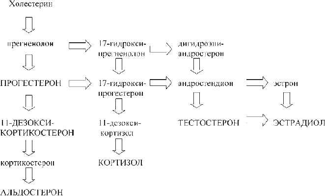Рис. 3–5. Схема биосинтеза стероидов. Заглавными буквами выделены основные представители семейств. Следует обратить внимание на метаболическую близость стероидов с различным биологическим действием, т. е. на потенциальную легкость превращения одного стероида в другой. Эта метаболическая близость имеет практическое следствие: при стрессе увеличивается секреция не только глюкокортикоидов, но и других стероидов. У разных индивидуумов при стрессе увеличивается секреция стероидов разных семейств