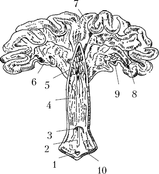 Органы размножения свиньи: 1 – клитор; 2 – преддверие влагалища; 3 – отверстие мочеиспускательного канала; 4 – влагалище; 5 – шейка матки; 6 – яйцепровод; 7 – тело матки; 8 – рог матки; 9 – яичники; 10 – половые губы