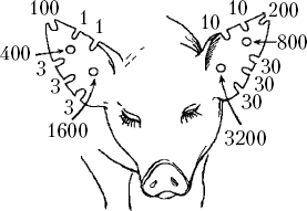 При этом на нижнем крае уха делают не более трех и на верхнем – не более двух выщипов. Места на ушах, где производят выщипы, дезинфицируют, ранки смазывают йодом или кровоостанавливающим раствором. Нумеровать поросят выщипами следует в первые дни после их рождения.