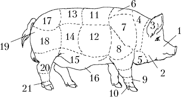 Стати телосложения хряка: 1 – голова; 2 – ганаши; 3 – уши; 4 – шея; 5 – подгрудок; 6 – холка; 7 – лопатка; 8 – плечо; 9 – пясть; 10 – бабка; 11 – спина; 12 – грудная клетка; 13 – поясница; 14 – подвздошная область; 15 – брюхо; 16 – препуциальный мешок; 17 – крестец; 18 – окорок; 19 – седалищная часть; 20 – скакательный сустав; 21 – бабка задней ноги