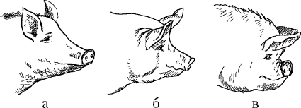 Отдельные стати телосложения хряка: а – узкая и длинная голова; б – тяжелая голова; в – короткая и мопсовидная голова