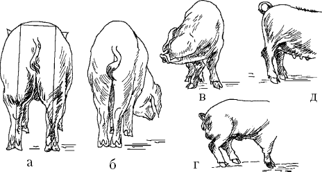 К недостаткам относят чрезмерно короткий, узкий, шиловидный, свислый крестец; короткие, слабовыполненные, срезанные окорока. Толстый хвост с грубой щетиной служит показателем грубой конституции, а свислость его указывает на вялость животного и дряблость мускулатуры.