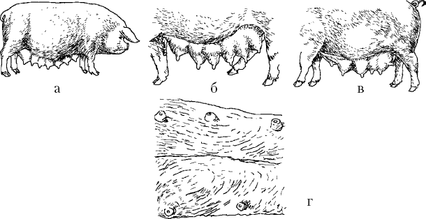 Вымя и соски. Вымя у маток должно быть хорошо развито, не менее чем с 12 равномерно и симметрично расположенными сосками. Матки с дряблым свислым выменем имеют плохую молочность. Количество сосков – наследственный признак; у маток и у хряков должно быть не менее 12 (желательно больше) сосков. Животных, не отвечающих этому требованию, для племенных целей не используют.
