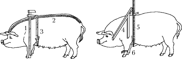Промеры у свиней берут в следующих точках. Длину туловища измеряют от затылочного гребня до корня хвоста; обхват, глубину и ширину груди – по линии, касательной к заднему углу лопатки; высоту в холке – от высшей точки холки по отвесу до земли.