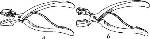 Щипцы для мечения свиней: а – для выщипов по краям уха; б – для выщипов в середине уха