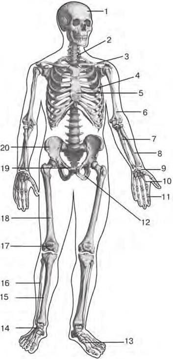 1 – skull (cranium); 2 – vertebral column (columna vertebrale); 3 – clavicle (clavicula); 4 – IV rib (costa IV); 5 – sternum (sternum); 6 – humerus (humerus); 7 – ulna (ulna); 8 – radius (radius); 9 – carpal bones (ossa carpi); 10 – metacarpal bones (ossa metacarpi); 11 – phalanges of hand (ossa digitorum manus); 12 – ischium (os ischium); 13 – metatarsal bones (ossa metatarsi); 14 – tarsal bones (ossa tarsi); 15 – tibia (tibia); 16 – fibula (fibula); 17 – patella (patella); 18 – femur (femur); 19 – pubis (os pubis); 20 – ilium (os ilium)