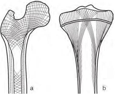 Fig. 1.3. Orientation of trabeculae in proximal epiphyses of tubular bones: a – in femur; b – in tibia