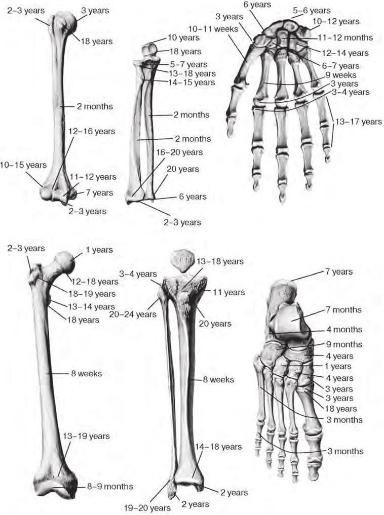 Osteal age does not always coincide with the passport age. In some children, the ossification process terminates 1–2 years earlier than it happens normally, in others – 1–2 years later. Starting from the age of 9 years, sexual differences of ossification can be distinguished clearly – in girls this process occurs more rapidly.