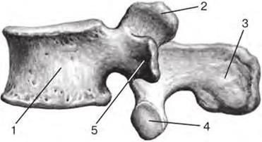 1 – vertebral body (corpus vertebrae); 2 – superior articular process (processus articularis superior); 3 – spinous process (processus spinosus); 4 – inferior articular process (processus articularis inferior); 5 – transverse process (processus transversus)