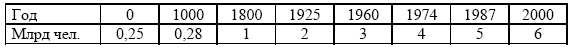 Начало голоцена (около 10 тыс. лет тому назад) – отправная точка для оценки современного состояния экосферы. В то время численность населения Земли составляла 5—10 млн чел. С того времени происходил в целом рост населения, сначала медленный и с колебаниями, а затем все более ускоряющийся. Количество людей на Земле изменялось следующим образом: